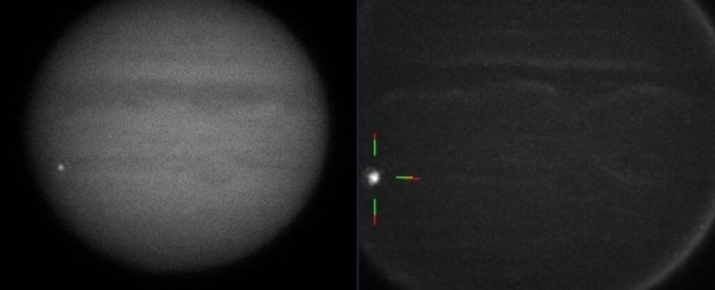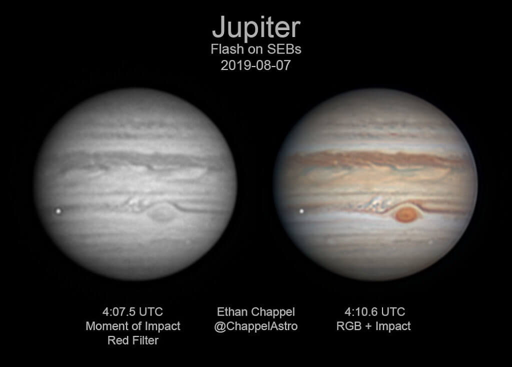 Ethan Chappel was out with his Celestron 8 telescope during that night, to watch the Perseid meteors but, as he ran the camera data through a program, he noticed a flash of light to the side of the planet. More precisely, at the South Equatorial Belt. The light became a small circle until it faded away completely.