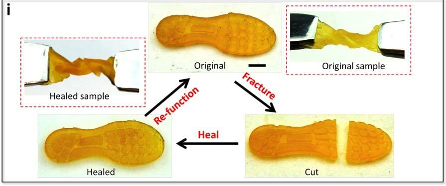 They demonstrated the material’s ability to heal itself in a wide range of products, from shoe pads to soft robot to multiphase composites and an electronic sensor.