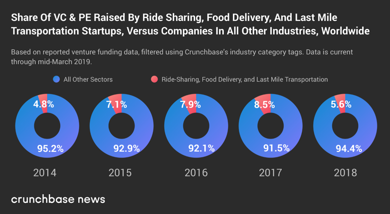 One way to evaluate success is how much funding the sector has raised. Based on a report for TechCrunch, ride-hailing, food delivery and last-mile transportation has raised “less than 10 percent of the total venture dollar volume reported for each of the past five full calendar years.”