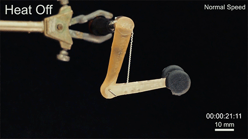 With that idea in mind, the team decided to work with polymers. They bonded two different polymers together that expanded differently when heated, which meant that, the polymer that is expanding faster when it gets warm is held back by the other, who doesn’t. This causes the material to curl and bend towards the side that expands at a slower rate.
