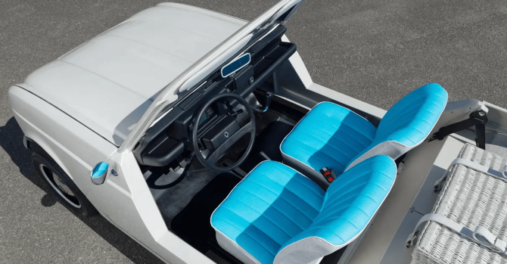 The e-Plein Air was created by Renault Classic, Renault Design and Melun Rétro Passion, which sells parts and accessories for older vehicles. The 1960s original was reportedly designed for the military, but it ended up as a beach car instead.