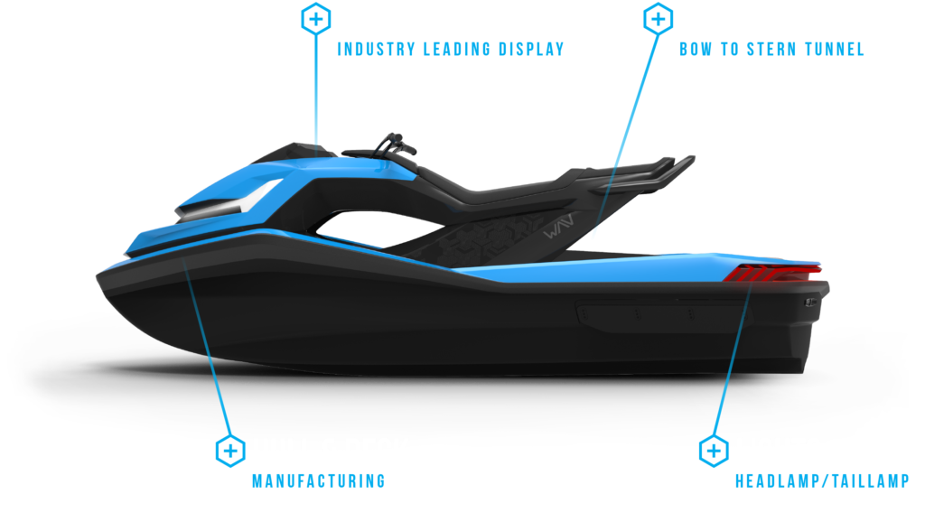 The Wav is a jet ski-looking vehicle that features a 12-inch, 4K dashboard display, as well as LED lights front and back, in addition to cruise control.